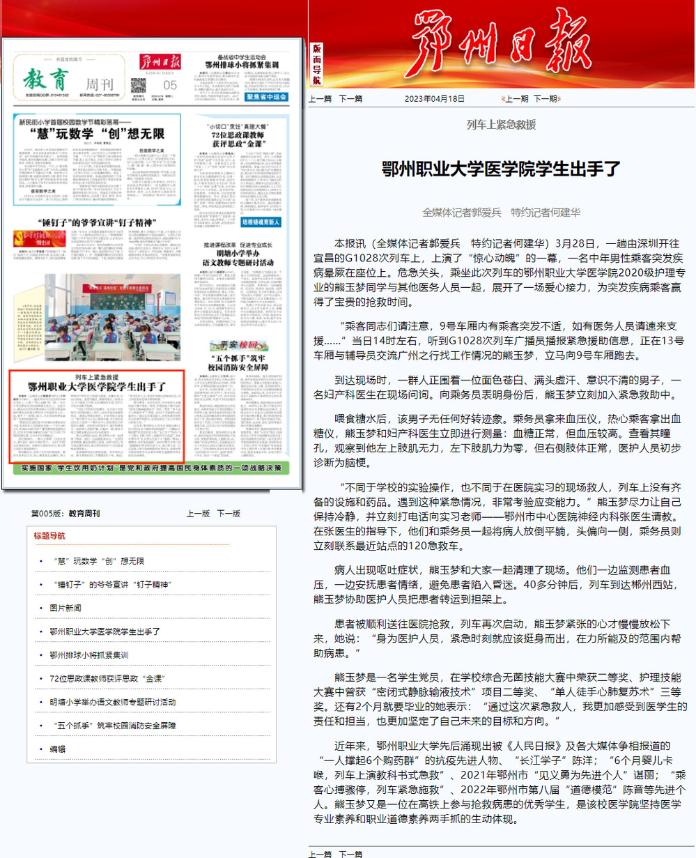 《鄂州日报》新闻来源链接:鄂州职业大学医学院学生出手了 (eznews.cn)