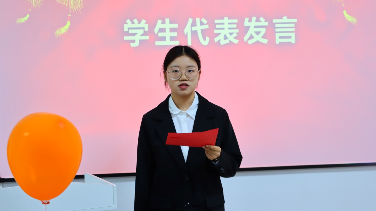 移动互联应用技术专业李文敬同学作为学生代表发言,感谢学校和企业提供了学以致用的机会,表示会怀着一颗感恩的心,珍惜这次机会,服从项目安排,完成项目交付,展示自我价值。