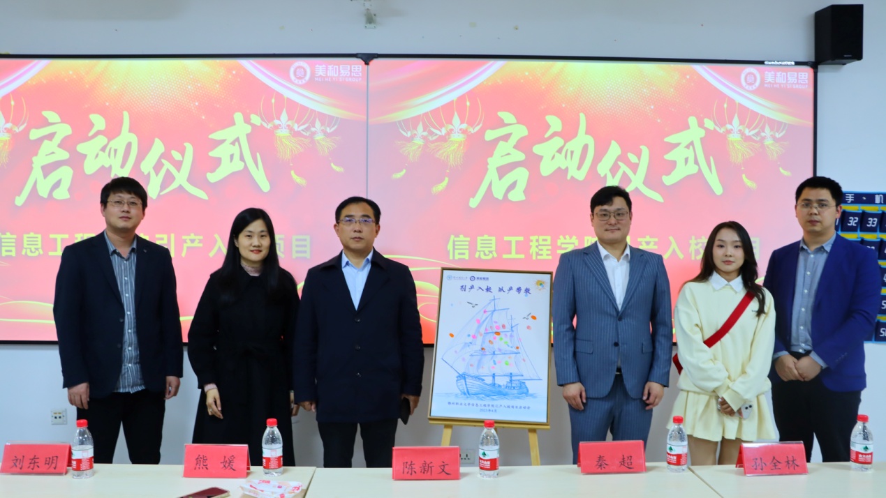 本网讯(通讯员 熊媛/文 学生记者 乐建冲/摄)4月24日下午,信息工程学院举行“引产入校”项目启动仪式。湖北尚庭信息技术服务有限公司总经理秦超、武汉美和易思数字科技有限公司校方负责人及学院主要负责人、部分师生参加了启动仪式。