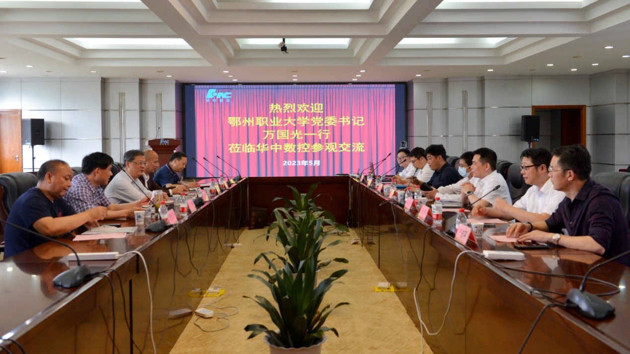 在武汉华中数控股份有限公司,万国光一行受到华中数控副总裁蒋荣良及公司团队的热情接待。在公司总裁助理、鄂州华数总经理周彬等人的带领下参观了华中数控展厅,了解了企业的发展历程、关键技术及应用、主要产品及发展现状。