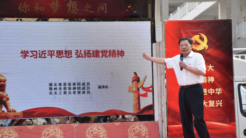 “我们每个人都有初心。建党时,革命先辈们的初心是要为人民谋幸福……”市委宣讲团成员、市关工委五老宣讲团成员谢泽琼向现场师生作党的二十大主题宣讲。他详细介绍了鄂州的红色历史、鄂州籍革命先辈的英雄事迹,以及党的二十大精神,并号召广大青年学子学好党史。