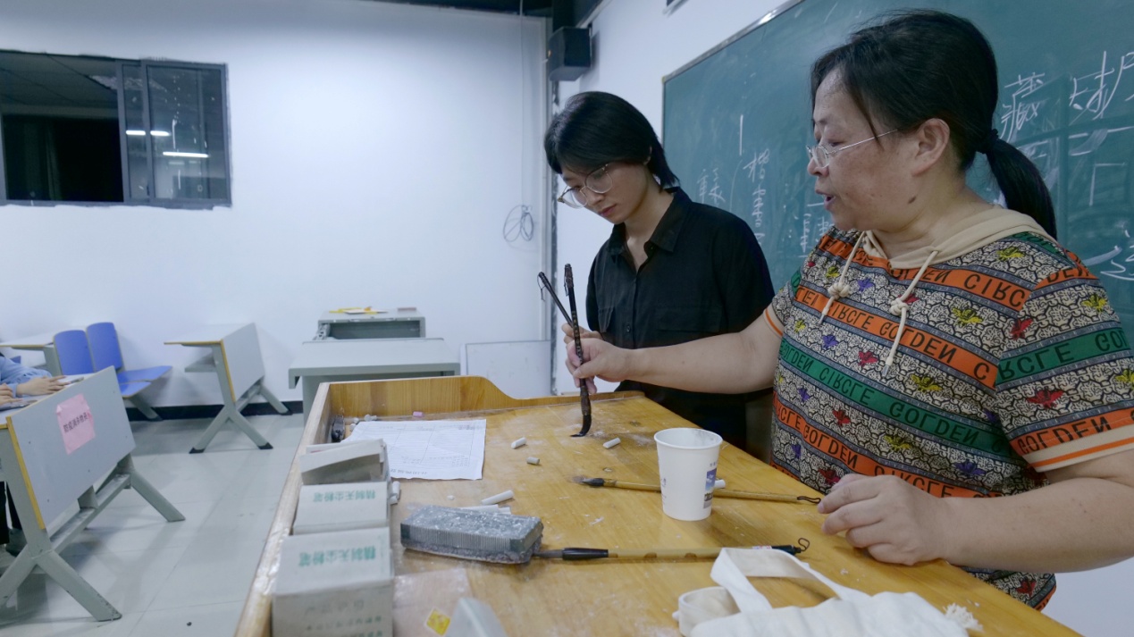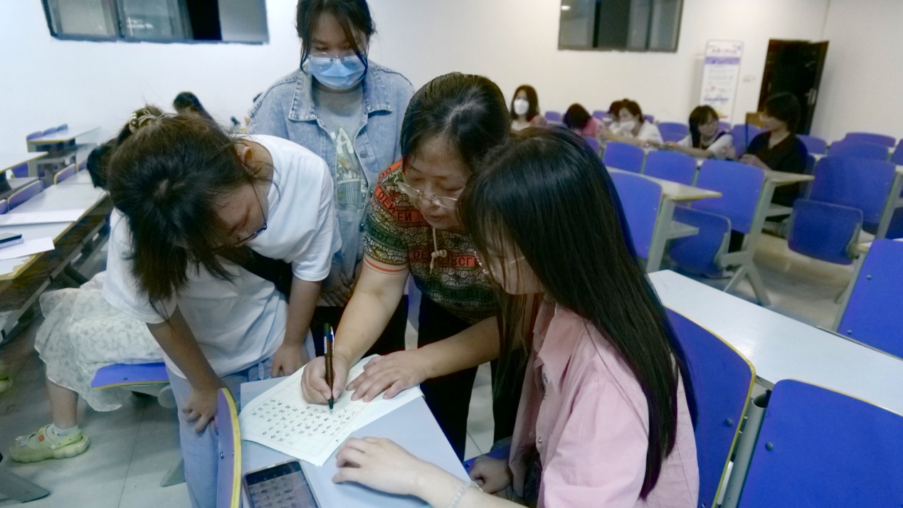 在现场指导和提问环节中,程老师与同学们进行一对一交流,面对面答疑解惑。期间,她还分享了自己的书法创作经历,其用心的阐述和耐心、细心的讲解,赢得了同学们的阵阵热烈掌声。