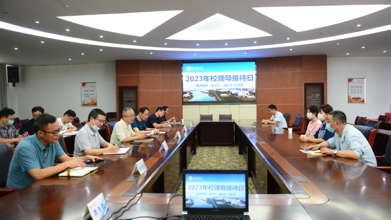 本网讯(记者 何建华 通讯员 夏小翔/文 何建华/摄)6月15日下午,校领导接待日活动在图书馆一楼会议室举行。副书记、副校长王家绪热情接待了来访师生,认真倾听师生的意见和建议,现场指导解决师生的实际困难。