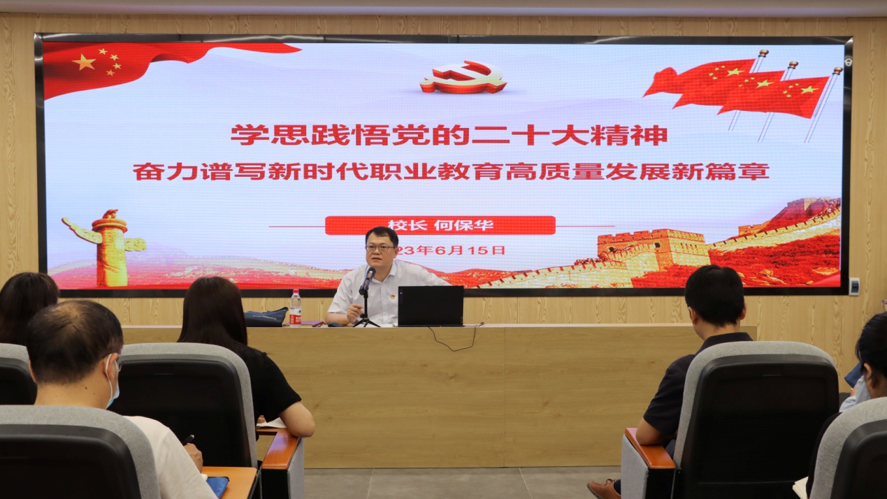 何保华以“七个深刻领悟”介绍了党的二十大盛况、取得的伟大成果和深刻的历史意义,梳理了十八大以来习近平总书记关于职业教育的重要讲话精神,深刻阐述了职业教育对促进经济发展和民生改善的重要作用,为推动现代职业教育高质量发展指明了方向。