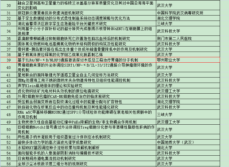 本网讯(记者 何建华)近日,省科技厅公布了2023年度湖北省自然科学基金立项项目清单,我校医学院教师潘朝旺申报的课题《基于TLR4/NF-κB/NLRP3通路激活探讨木瓜总三萜治疗胃癌的分子机制》获批一般面上项目立项,实现了学校省自然基金零的突破!