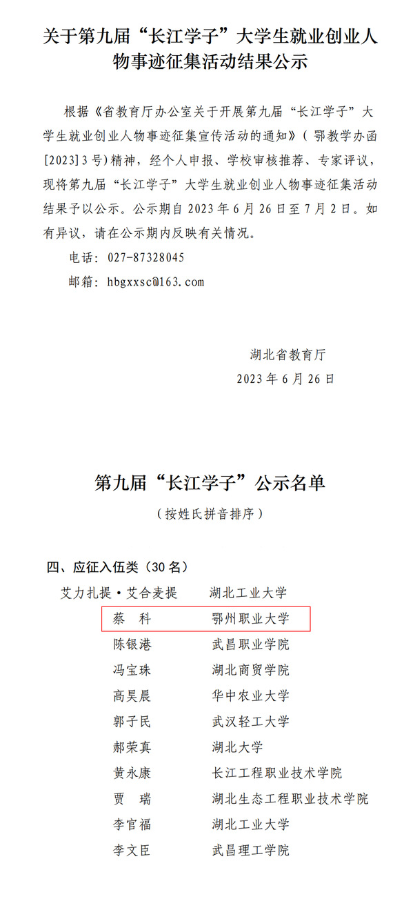 近日,湖北毕业生就业网站发布了第九届“长江学子”大学生就业创业人物事迹征集结果公示,我校体育课部学生蔡科入选参军入伍类大学生就业创业人物名单。
