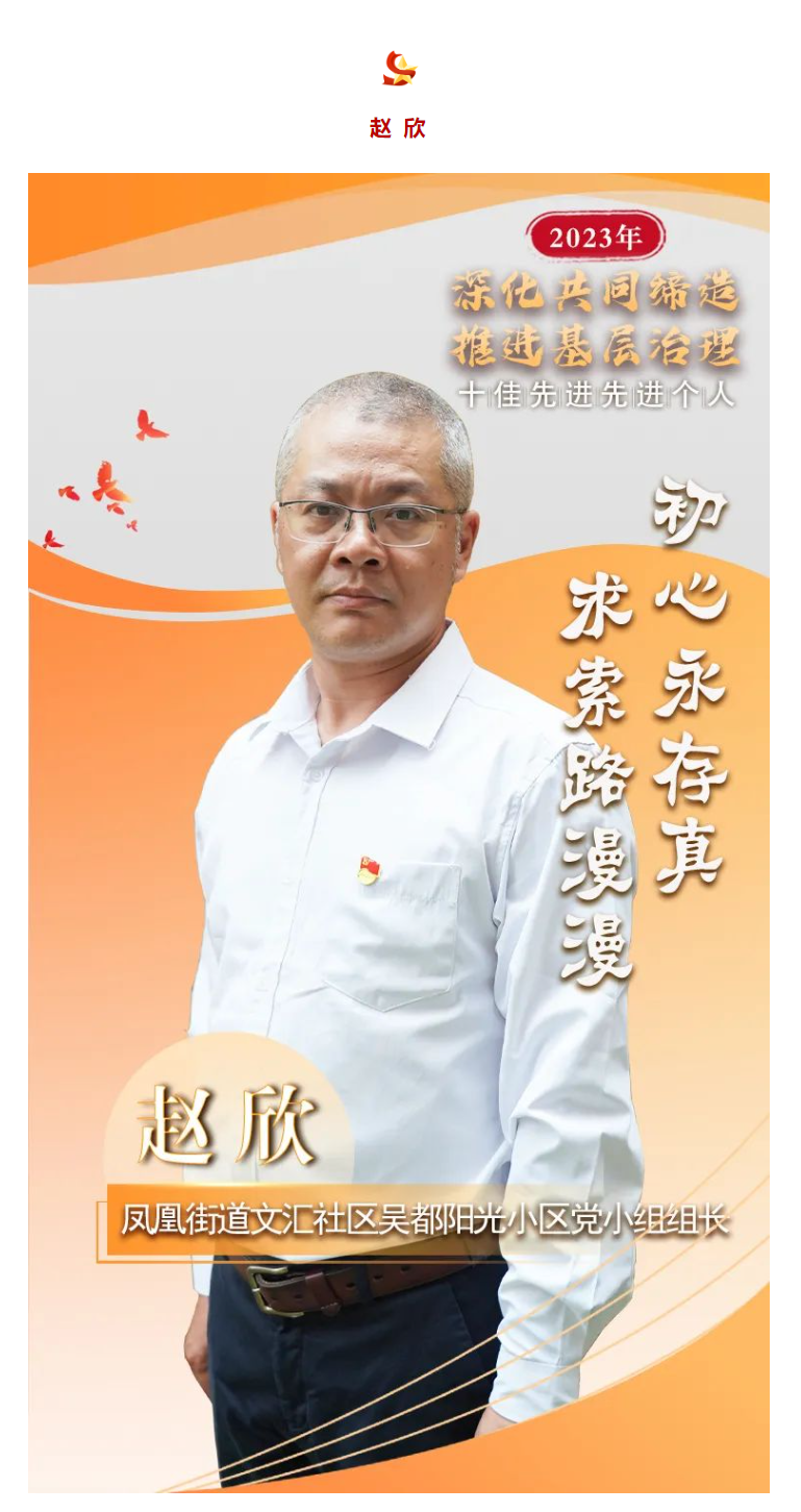 自开展党员下基层活动以来,赵欣积极响应号召,第一时间到所在社区、小区业委会党支部报到,以行动支持社区、小区业委会所组织的各项志愿者活动。服务期间,他还担任了凤凰街道文汇社区吴都阳光小区党小组组长一职。