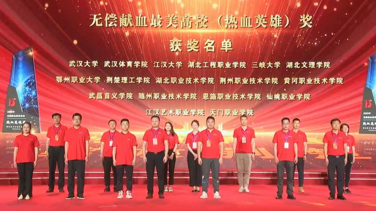本网讯(记者 何建华/文 学生记者 苏景盛/摄)6月14日是第20个世界献血者日。当天上午,湖北省暨武汉市第20个世界献血者日主题宣传活动在武汉体育学院隆重举行,来自全省各市州无偿献血优秀单位和先进个人获得表彰。我校荣获湖北省无偿献血最美高校(热血英雄)奖。