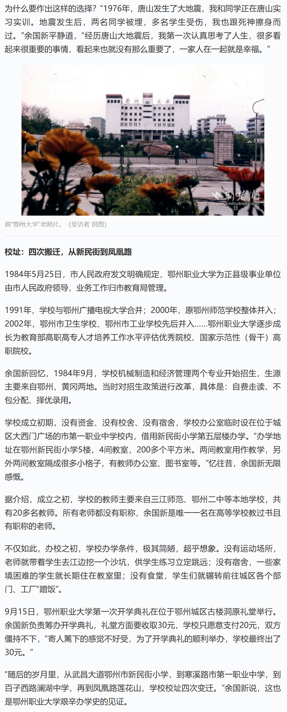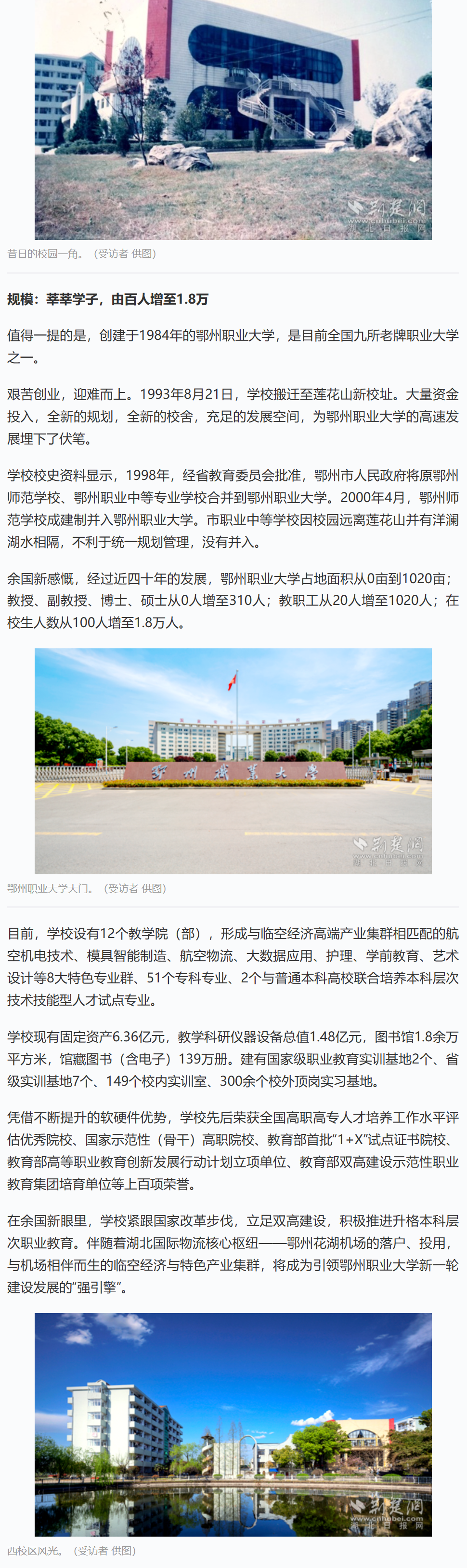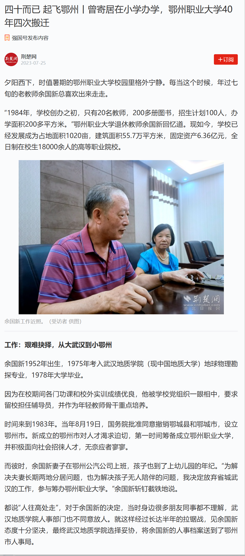 《学习强国》新闻来源网址链接:四十而已 起飞鄂州丨曾寄居在小学办学,鄂州职业大学40年四次搬迁 (xuexi.cn)