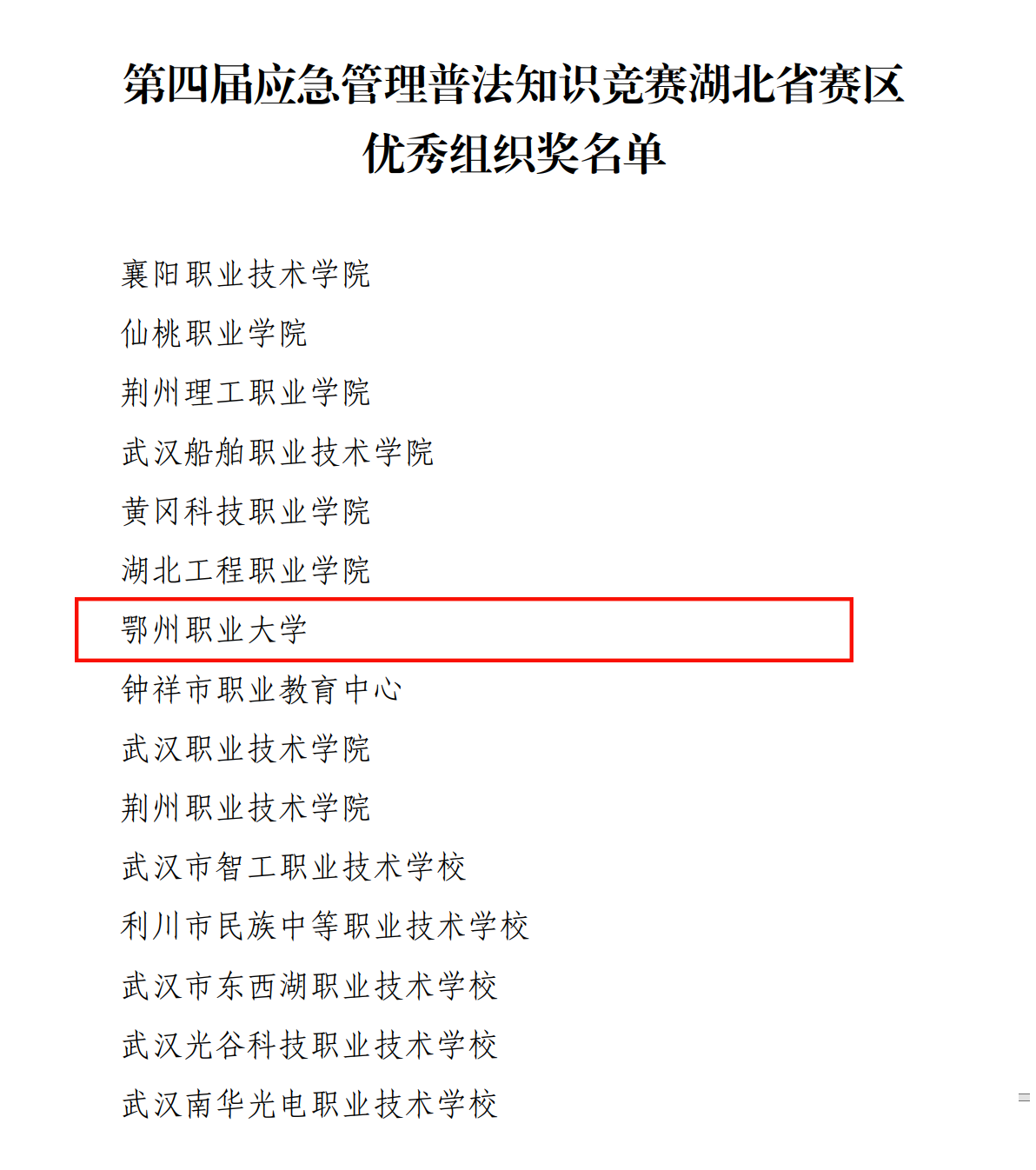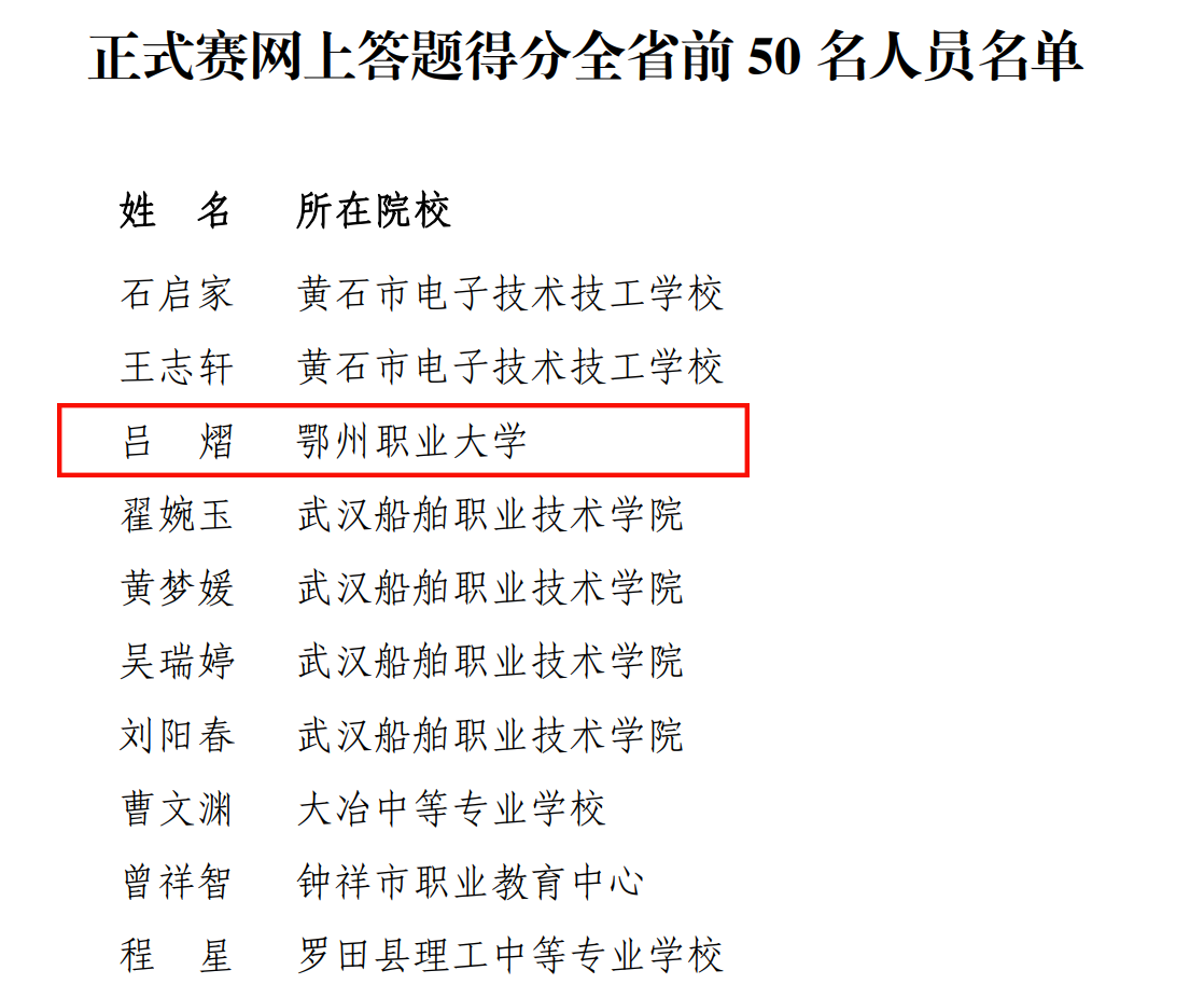 本网讯(记者 何建华)近日,省应急管理厅、省司法厅、省教育厅、省人力资源和社会保障厅、省普法工作办公室联合发文,表扬积极组织参加第四届应急管理普法知识竞赛活动有关单位和个人。我校获得优秀组织奖,吕熠同学获得正式赛网上答题得分全省前 50 名。