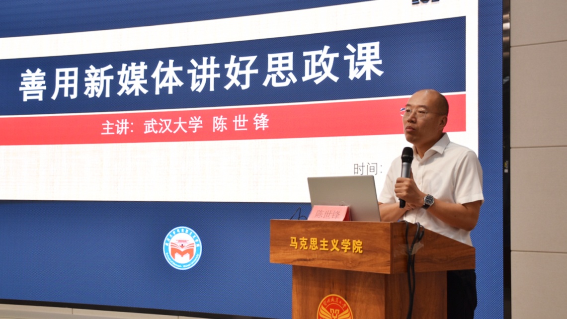 武汉大学马克思主义学院副院长陈世峰副教授为大家作了《善用新媒体 讲好大思政》的专题报告。他以自己亲身参与策划制作的“网红节目”武大版“锵锵三人行”——《马上见》栏目为例,表示思政课教师要跳出身份的限制,可以是“媒体人”、“制作人”“节目策划人”等,要以“思政课+互联网+跨学科”为独特定位,打造内涵式的互联网思政作品,让思政学科走出去,真实有效地面向青年学生和社会公众。