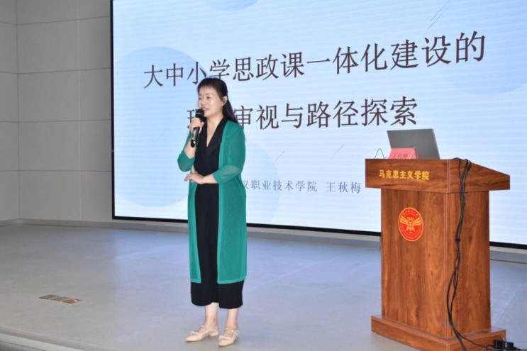 武汉职业技术学院马克思主义学院院长王秋梅教授以《大中小学思政课一体化建设的逻辑与路径》为题,从大中小学思政一体化建设的内涵、现实审视、逻辑理路、建设路径四个方面阐述对大中小学一体化建设的研究与思考。