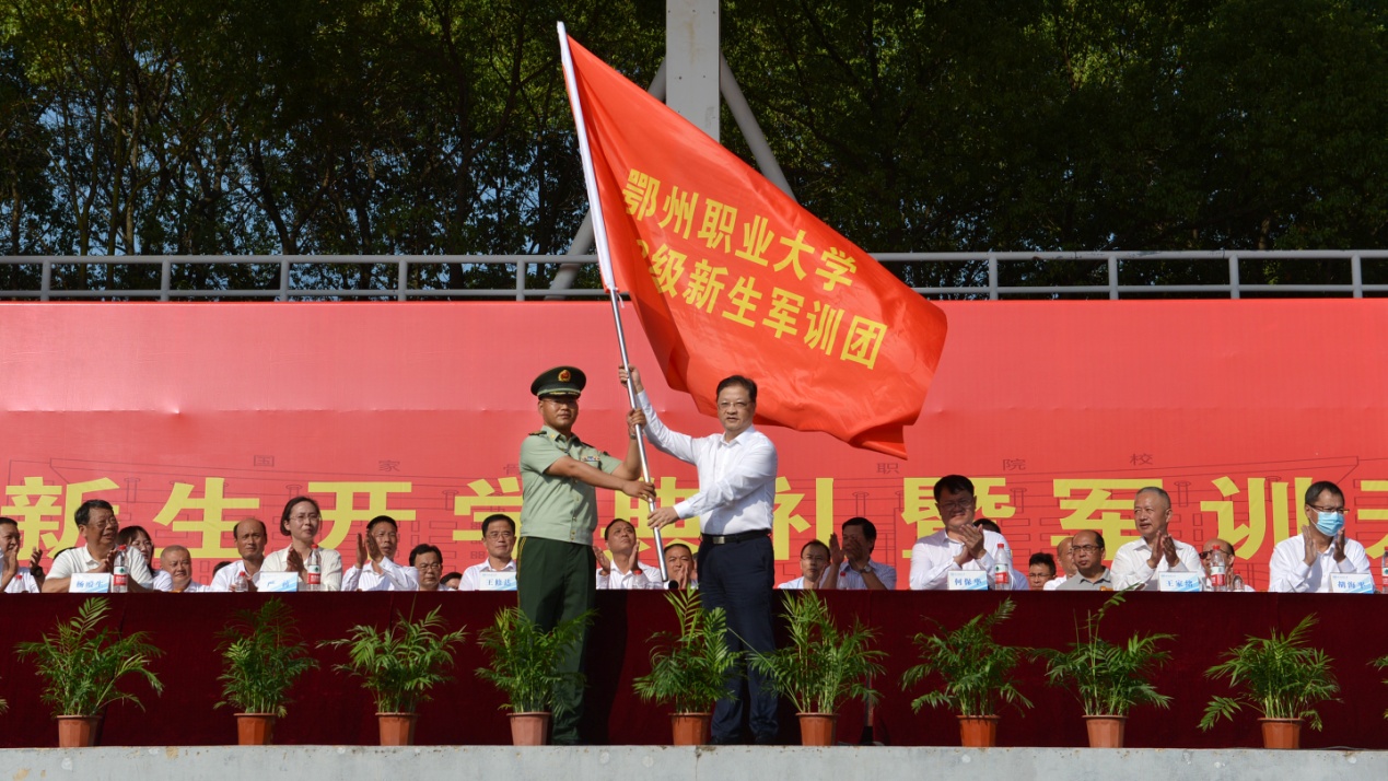 万国光向新生军训团授旗,标志着2023级新生军训正式开始。