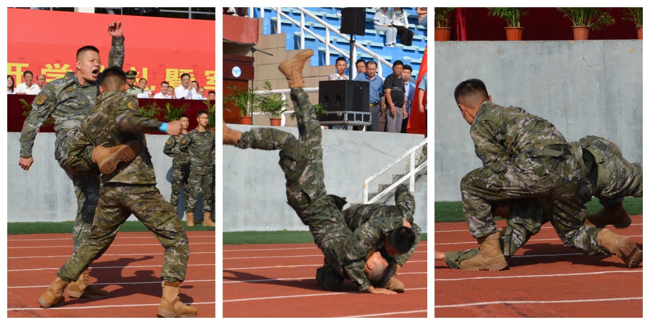 承训教官们分别展示了擒敌拳、倒功、抗击打等实战技能。制敌先机的招式、灵动多变的动作、刚劲有力而又整齐划一的演示,赢得同学们阵阵掌声和喝彩,也为参训学生树立了榜样。
