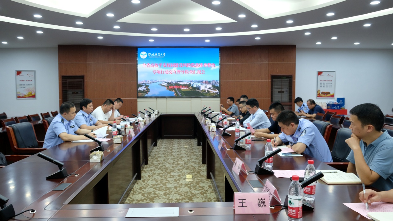马凌军代表学校对督导检查组到校检查工作表示欢迎,并从加强组织领导、强化政治安全、压实工作举措、加强“人防、物防、技防”建设、强化防范处理等方面介绍了我校平安校园建设推进情况和工作特色与创新、存在的问题以及下一步的打算。