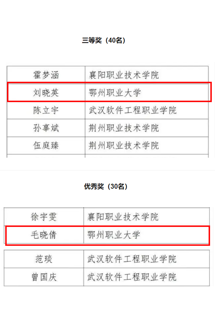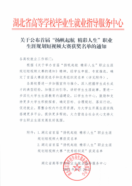 本网讯(通讯员 高小燕)近日,由湖北省高等学校毕业生就业指导服务中心主办、长江网承办的“扬帆起航 精彩人生”湖北省首届大学生职业生涯规划短视频大赛获奖名单正式公布,我校教育管理学院刘晓英同学和机械工程学院毛小倩同学分别荣获三等奖和优秀奖。