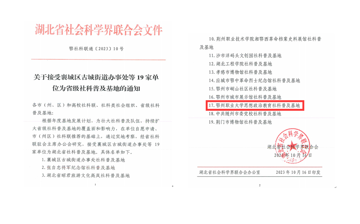 本网讯(通讯员 吴冠勇)近日,马克思主义学院申报的“鄂州职业大学思想政治教育社科普及基地”成功获批成为新增的省级社科普及基地。