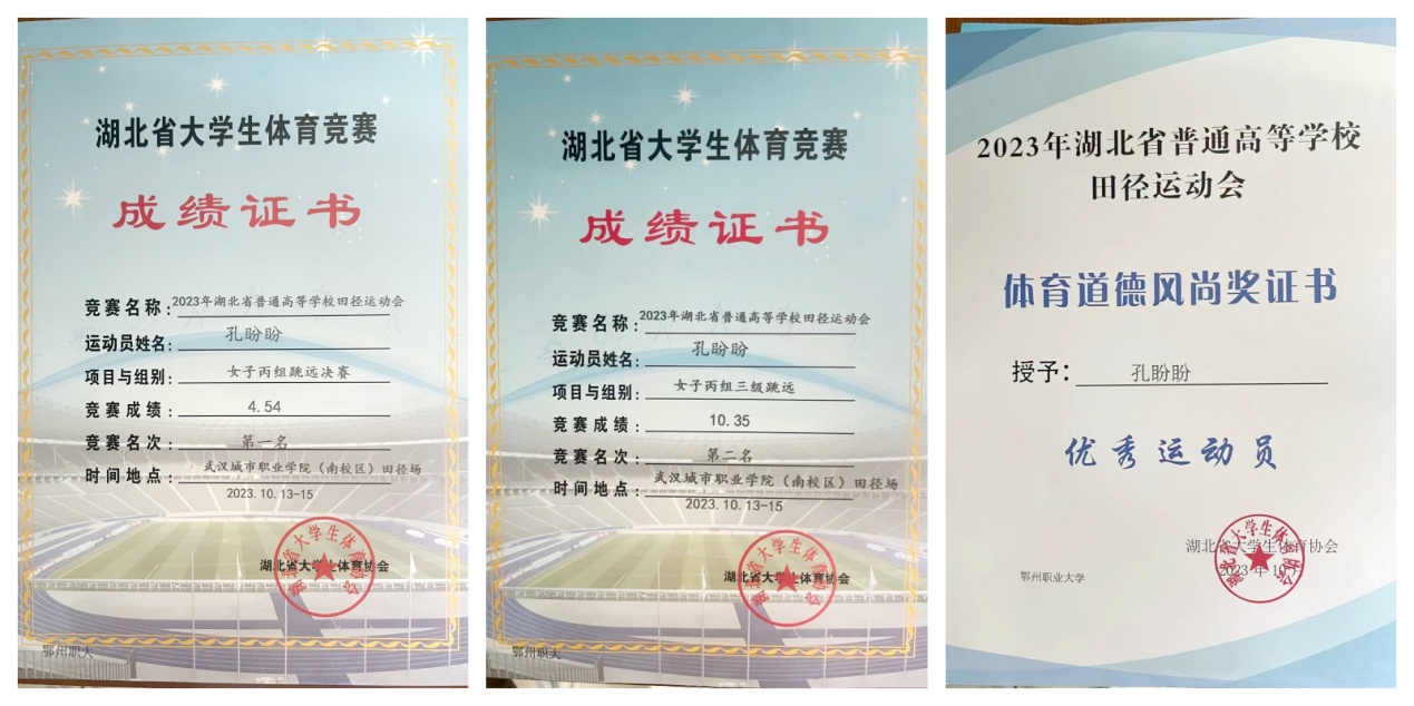 近日,在刚刚结束的2023年湖北省普通高等学校田径运动会上,我校21级体育教育二班的孔盼盼同学斩获了女子丙组跳远第一名和三级跳远第二名的好成绩。值得一提的是,这是她第三次参加省赛,也是第三次夺冠。2021年,她斩获了三级跳远第一名和跳远第三名;2022年,她再次斩获了三级跳远第一名和跳远第二名的好成绩,是省赛这两个项目上近三年来的强势选手。