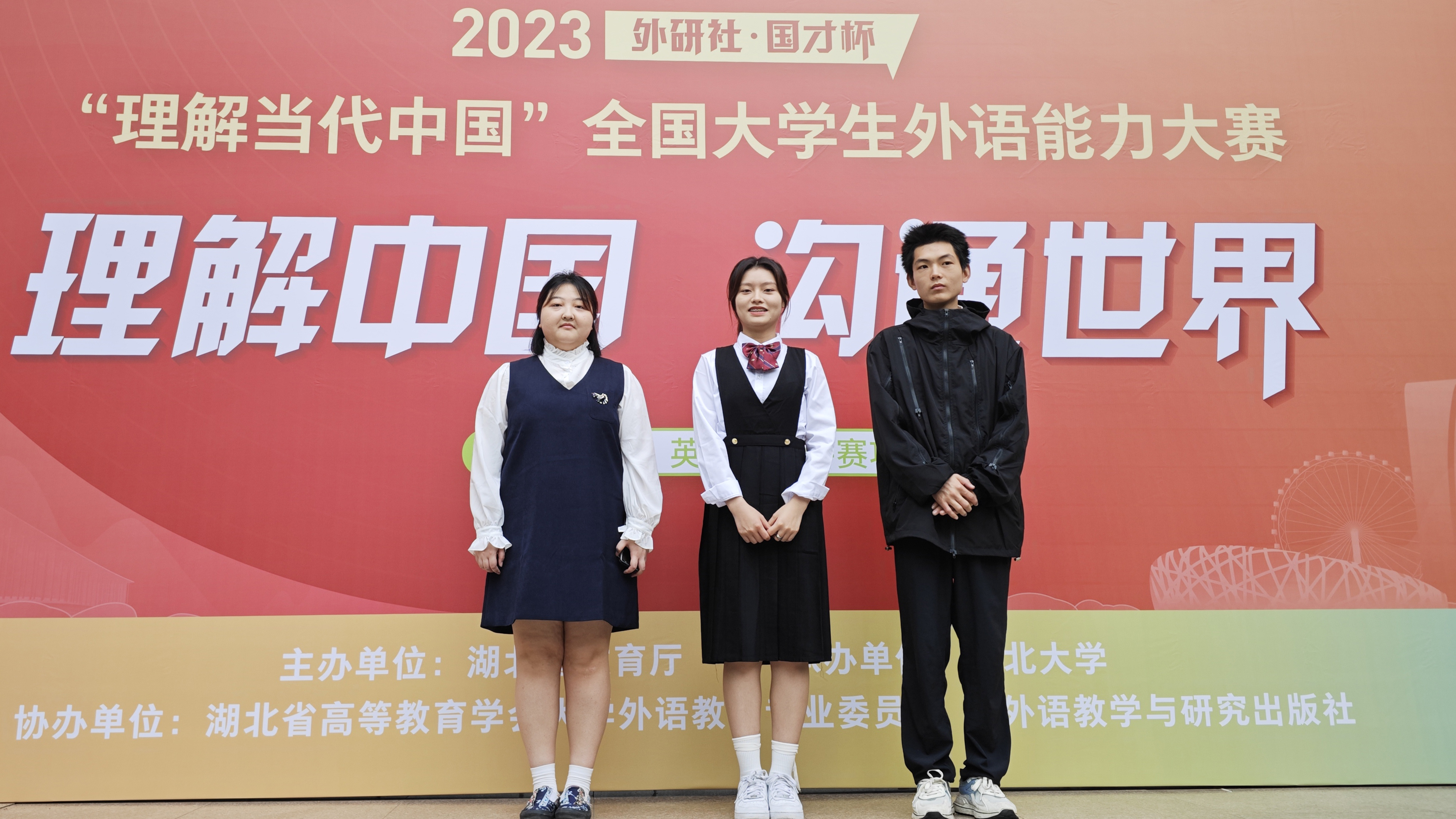 本网讯(通讯员 杨培沛)10月29日,“外研社·国才杯”“理解当代中国”全国大学生外语能力大赛湖北赛区演讲比赛在湖北大学落下帷幕。来自全省各院校的132名选手参赛,我校2021级飞机机电维修专业学生戚佳骏、2022级小学英语教育学生朱巧宇和2021级小学英语教育学生三名学子成功晋级决赛,并荣获三项铜奖。