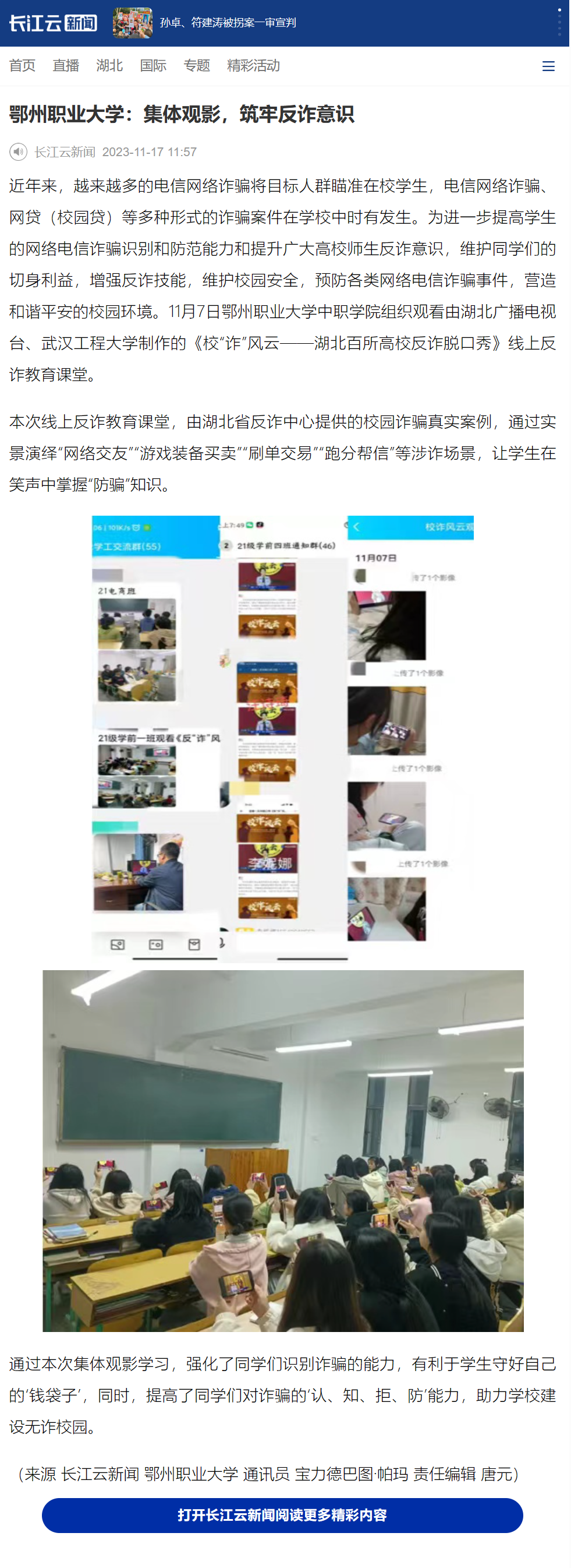 长江云新闻——鄂州职业大学:集体观影,筑牢反诈意识