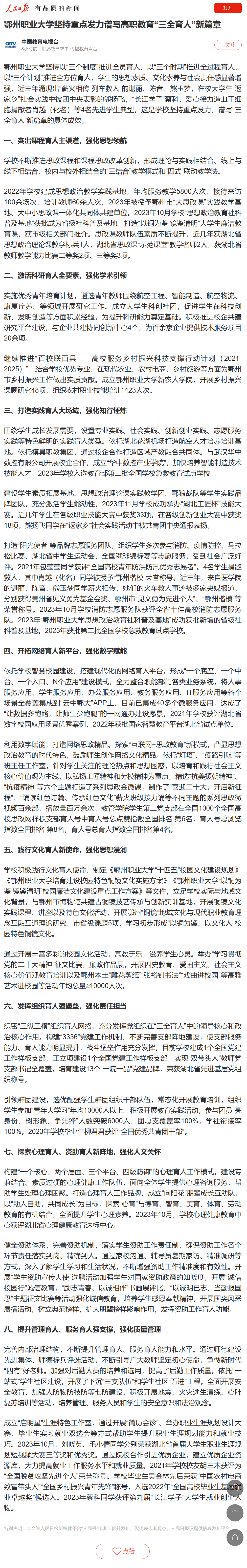 《学习强国》新闻来源链接:鄂州职业大学坚持重点发力谱写高职教育“三全育人”新篇章 (xuexi.cn)