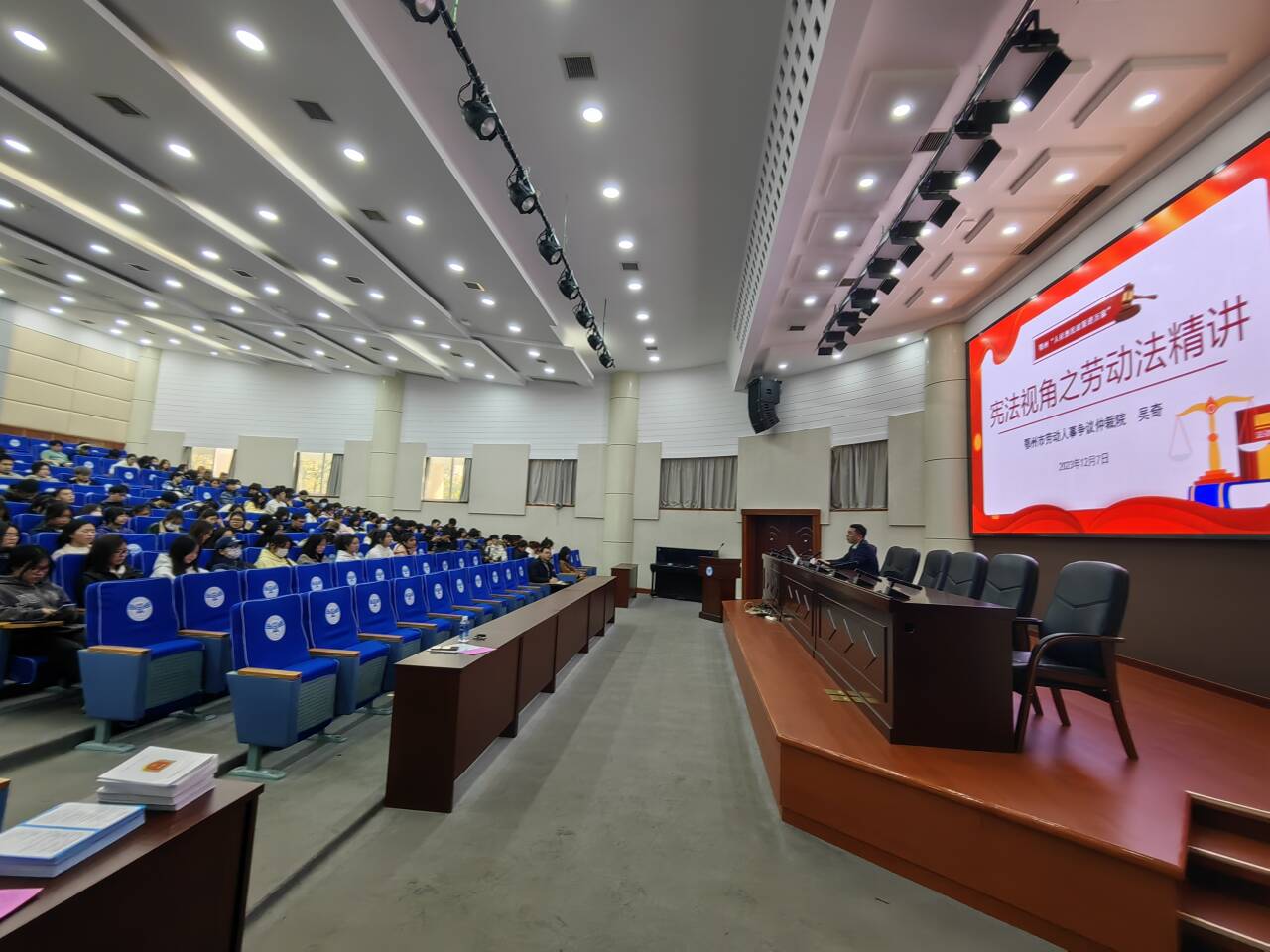 市劳动人事仲裁院吴琦做了题为“宪法视角之劳动法精讲”的主题讲座。他结合典型案例,向师生介绍了劳动合同的签订、劳资双方的权利与义务、劳动合同的终止与解除、劳动者的职业保护及劳动争议处理等劳动法律知识。
