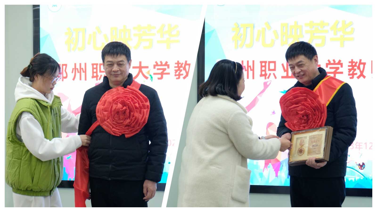 活动中宣读了何祥林老师的荣休通知,学生代表、教师代表分别为何祥林老师佩戴荣誉红花、绶带、颁发退休证,校工会代表向何祥林老师赠送工会纪念品。