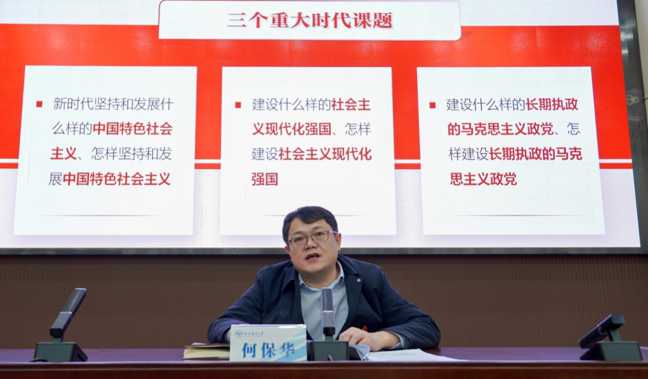 何保华从深刻领会党的二十大精神、为全面建设社会主义现代化国家贡献青春力量两个方面,细致解读了党的二十大的主题,带领大家深刻领会过去五年工作和新时代十年伟大变革的重大意义,开辟马克思主义中国化时代化新境界的重要论述,中国式现代化的中国特色、本质要求和推进中国式现代化建设的重大原则,全面建设社会主义现代化国家的目标任务等内容。