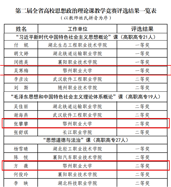 本网讯(通讯员 张攀攀) 近日,省教育厅公示了第二届全省高校思想政治理论课教学竞赛评选结果,经资格审核、专家评审、现场展示、政治把关等环节,我校马克思主义学院教师吴寒梅获《习近平新时代中国特色社会主义思想概论》课程一等奖,方薇获《思想道德与法治》课程二等奖,张攀攀获《毛泽东思想和中国特色社会主义理论体系概论》课程二等奖。