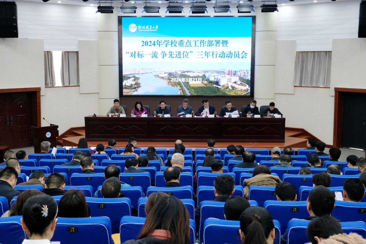 本网讯(记者 何建华)3月21日下午,我校召开全校干部大会,部署2024年重点工作,号召全体教职员工对标一流,学习借鉴省内外一流高等职业院校先进经验,立标赶超,争先进位,不断提高学校内涵建设质量,为创建中国特色“双高”职业学校夯实基础。校党委书记万国光、校长何保华等党委班子成员、中层副职以上领导干部、支部书记、教研室主任参加会议。会议由校党委副书记王家绪主持。