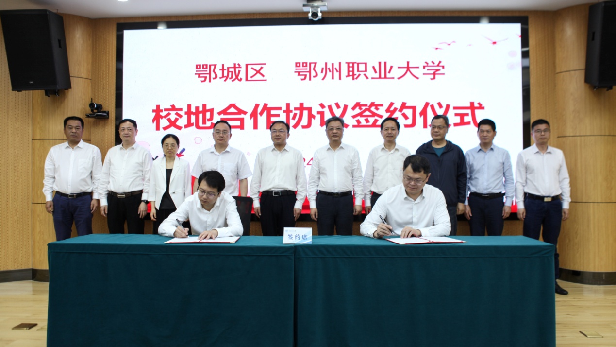 在双方共同见证下,何保华与曹晖分别代表鄂州职业大学与鄂城区签订《校地合作协议》。