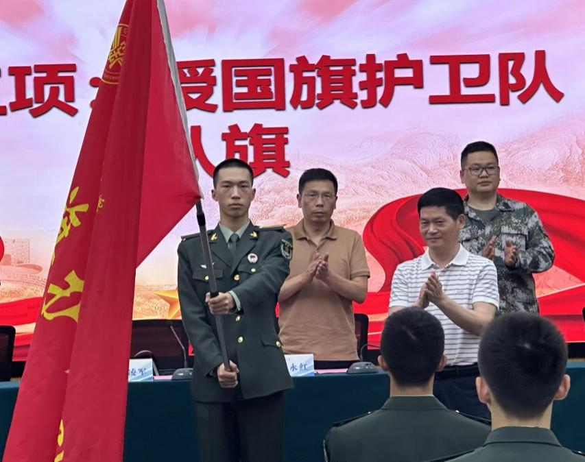 熠熠生辉的队旗象征着责任与使命的传递,马凌军郑重地向国旗护卫队授队旗,与会领导为国旗护卫队队员颁发队员聘书。国旗护卫队队员刘阳上台代表全体成员发言表决心。