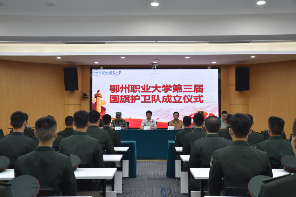 仪式伊始,全体人员庄严肃立,奏唱国歌,激昂的旋律在会场回荡。随后,学工部部长陈永红宣读了《关于成立鄂州职业大学第三届国旗护卫队的决定》。
