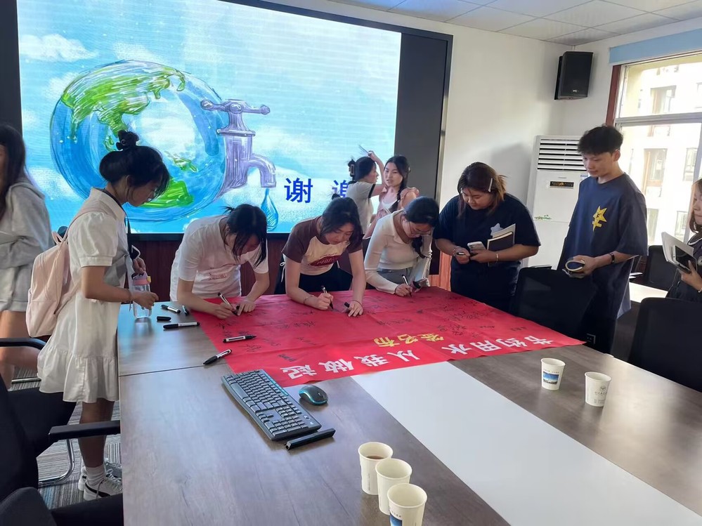 最后,聆听讲座的同学们在节水宣传条幅上签下自己的名字。 “水是生命之源,节水护水,是我们每个人的责任。节水签名,从我做起,签下的是一种承诺,培养的是一种习惯。” 教育管理学院学生张润萍如是说。