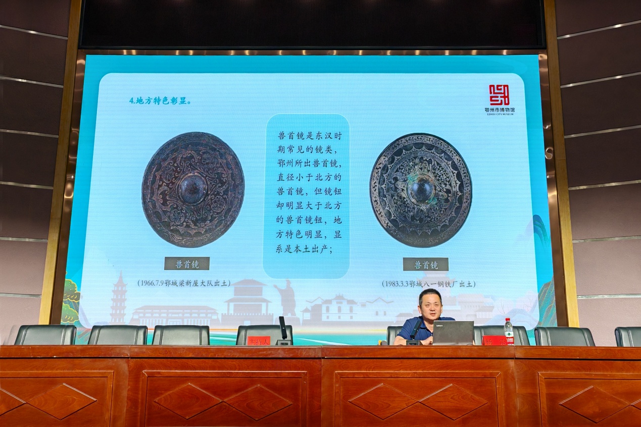 杨震馆长向大家介绍了六朝武昌城的历史背景、地理位置及城市布局以及近年来的考古发现、文物故事,详细讲解了鄂州古铜镜的特点、出土规模、纹饰铭文、制作工艺等方面的文博知识,通过一张张生动的照片和充满激情的精彩讲解,让大家既感受到鄂州悠久灿烂的文化,又明白了传承、保护和发展鄂州文化的责任。