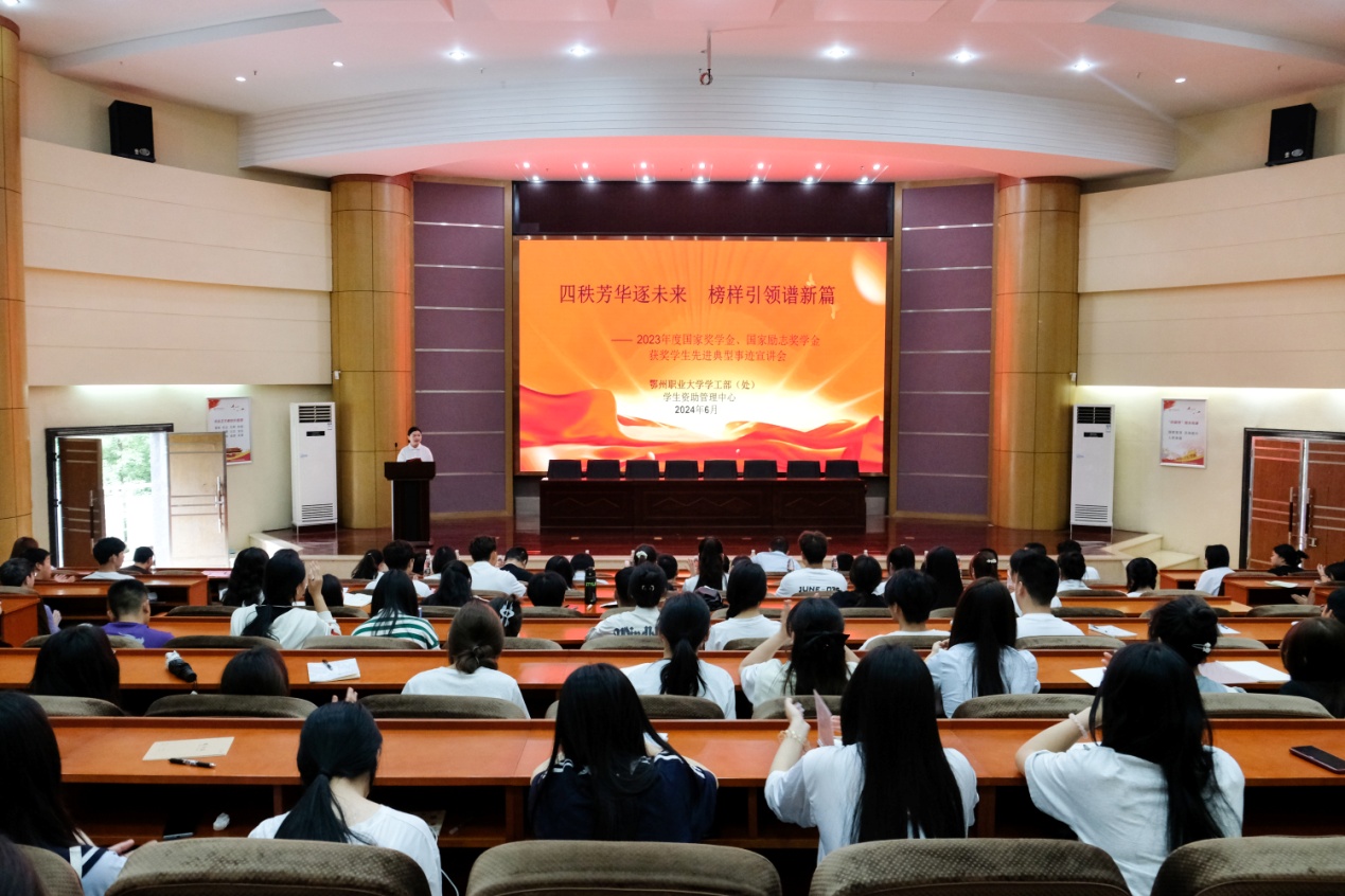 本网讯(记者 何建华)6月4日下午,我校“四秩芳华逐未来 榜样引领谱新篇”2023年度国家奖学金、国家励志奖学金获奖学生先进典型事迹宣讲会在求真楼学术报告厅举行。各院(部)共计200余名学生代表参会。