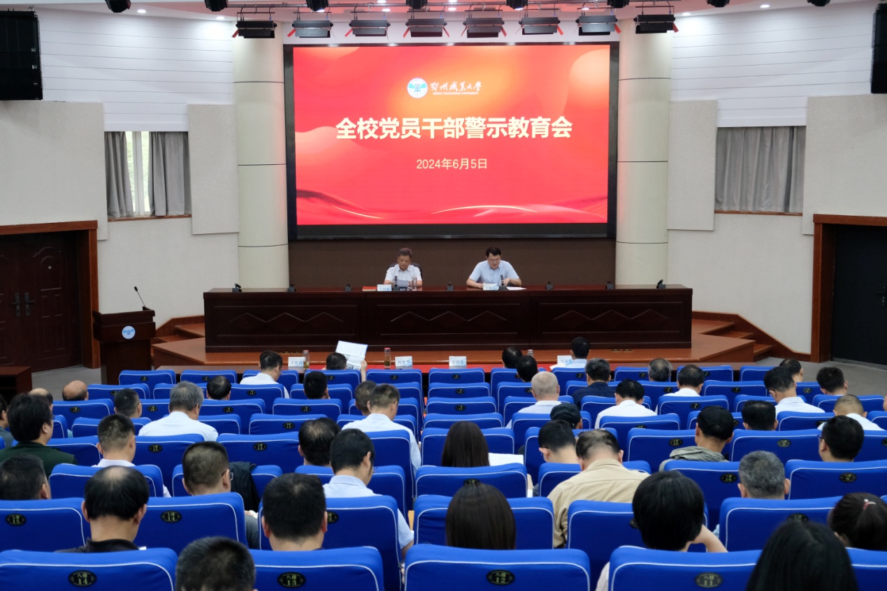 本网讯(记者 何建华)6月5日下午,我校在图书馆二楼学术报告厅召开全校党员干部警示教育会,进一步深入推进党风廉政建设和反腐败斗争,为学校事业发展提供坚强政治保证。校党委书记万国光作题为“筑牢纪律之基,自觉做遵规守纪的标杆”的讲话。校长何保华主持会议。