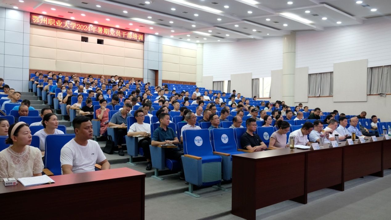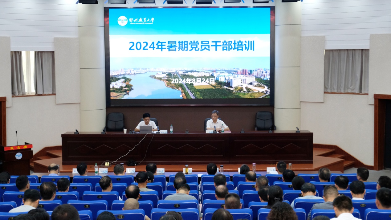 本网讯(记者 何建华)8月24日,鄂州职业大学2024年暑期培训在图书馆二楼学术报告厅开班。市委宣讲团成员、市社科联党组书记谢祚兴同志以“紧紧围绕推进中国式现代化进一步全面深化改革”为题,来校作学习贯彻党的二十届三中全会精神宣讲。校党委书记万国光主持并讲话。