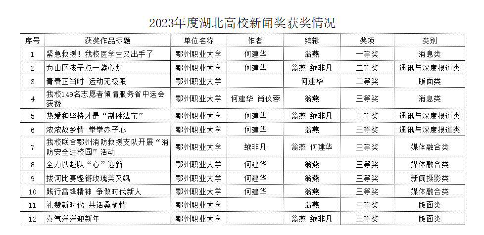 本网讯(记者 何建华) 近日,2023年度湖北高校新闻奖评选结果揭晓,由我校宣传部选送的新闻作品中有12件获奖,其中一等奖1件,二等奖2件,三等奖9件,在获奖等级和获奖数量上均实现新突破。