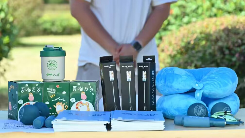 市委组织部官方账号“观英阁”携手鄂州人才服务联盟在我校迎新现场为“新鄂州人”接风。他们为“新鄂州人”量身定制了迎新大礼包——鄂州人才专属文创礼品,如拓印“鄂州人才”的杯子、U型枕、手机支架、跳绳、充电线,当然,还有备受欢迎的定制布艺袋,每一个礼品都是工作生活的常用品,饱含鄂州的爱才之心。