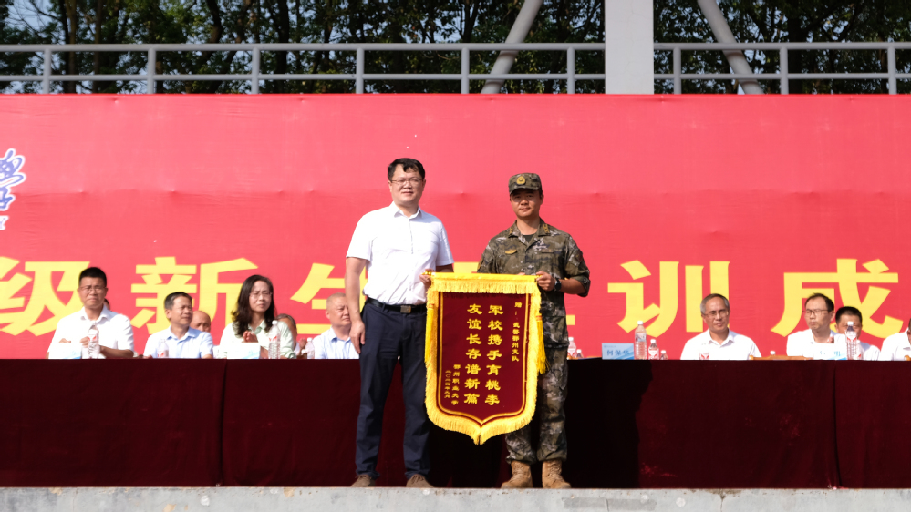 何保华向承训部队赠送锦旗,感谢武警鄂州支队对我校军训工作给予的大力支持。