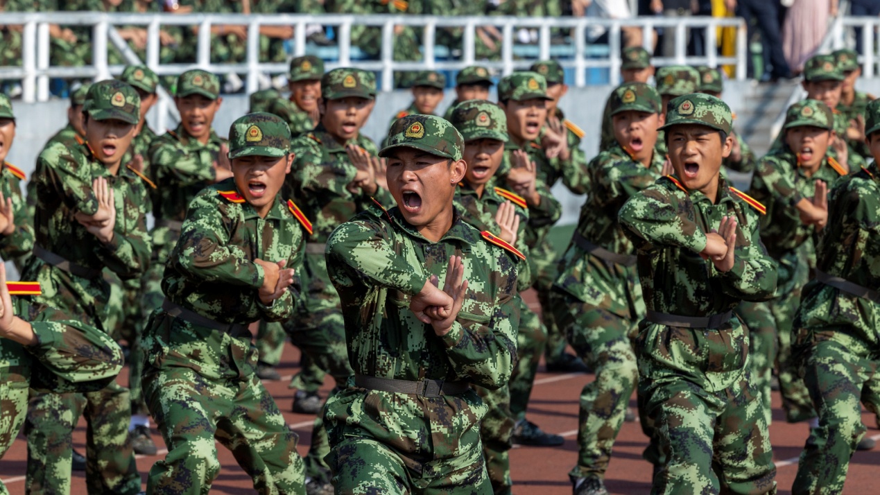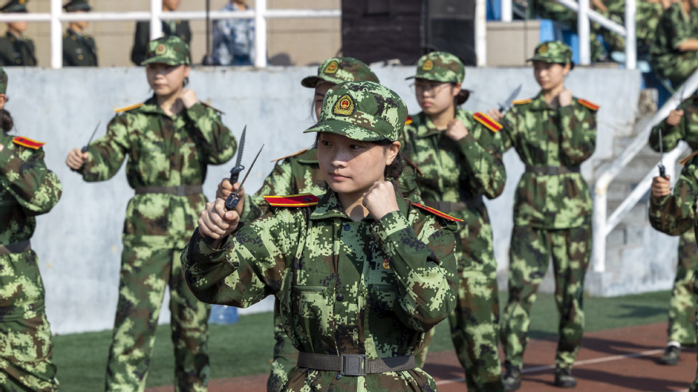 “杀!”随着一声整齐的呐喊声,女子匕首操方阵精彩出场。手持利刃的女生们英气逼人,一招一式颇有章法也极具爆发力,展现出巾帼不让须眉的气势。