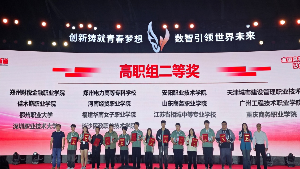 本网讯(通讯员李辉/文 王涛/摄)近日,全国高等院校数智化企业经营沙盘大赛总决赛在河南郑州落下帷幕,来自全国各地的200余支代表队参加了比赛。由我校商学院学生潘鹏、曾梓璇、程亚琪、沈靖棋等4名学生组成的代表队,在指导老师李辉、王涛的带领下,以湖北省高职组第一名的成绩挺进决赛,并在总决赛上荣获二等奖。