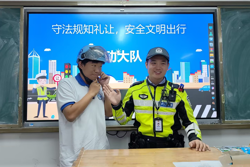 活动现场,铁骑队员通过视频和图片,向同学们展示真实案例中不佩戴安全头盔和不系安全带所带来的严重后果,强调了“一盔一带”在交通安全中的重要性。铁骑队员还现场示范了如何正确佩戴安全头盔,并邀请学生上台互动,让同学们掌握正确的佩戴方法。同时,他们还耐心解答了大家提出的各种交通安全问题,提醒大家不仅要自己遵守交通规则,还要提醒家人和朋友共同关注交通安全。