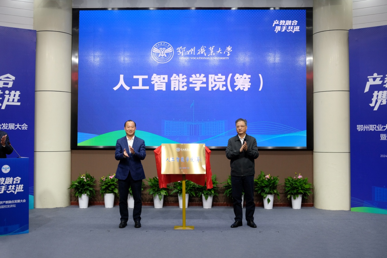 鄂州市委副书记、政法委书记、教育工委书记汪小波,校党委书记万国光为鄂州职业大学人工智能学院揭牌。