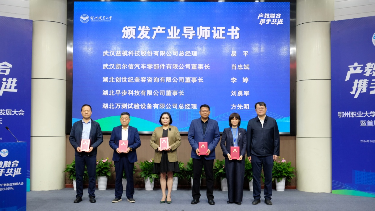 聘任仪式上,校长何保华为武汉益模科技股份有限公司总经理易平、武汉凯尔信汽车零部件有限公司总经理肖忠斌、湖北创世纪美容咨询有限公司董事长李婷、湖北平步科技有限公司董事长刘勇军、湖北万测试验设备有限公司总经理方先明、浙江忆韵乡情商贸有限公司总经理杜高山、上海至臻联合会计事务所主任会计师孟岭、鄂州市鸿达印务有限公司董事长李庚寅、湖北省葛店开发区勘测院副院长曾云飞、鄂州市中心医院护理部主任汪迎春等10位行业、企业专家颁发产业导师聘书。