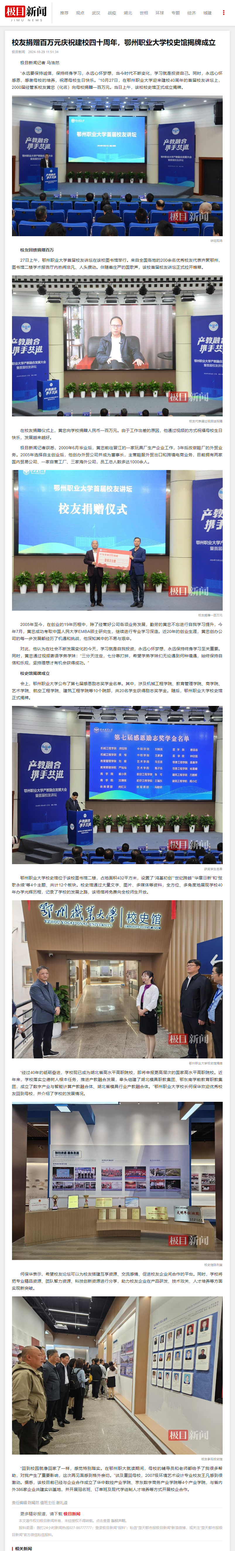 极目新闻——校友捐赠百万元庆祝建校四十周年,鄂州职业大学校史馆揭牌成立