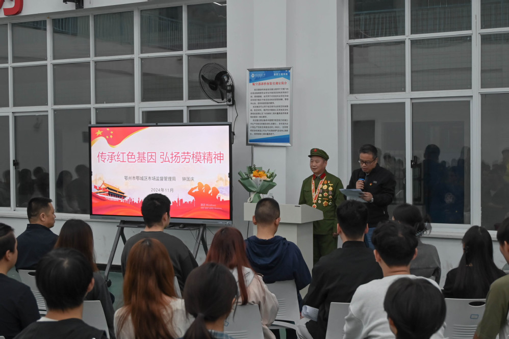 本网讯(学生记者 刘畅 李宏春/文 朱可可/摄)11月14日晚,我校举办“赓续红色基因,弘扬劳模精神”——全国劳模进“一站式”学生社区活动。全国劳动模范、鄂州市鄂城区市场监督管理局工会主席钟国庆走进航空工程学院,为师生代表作宣讲。