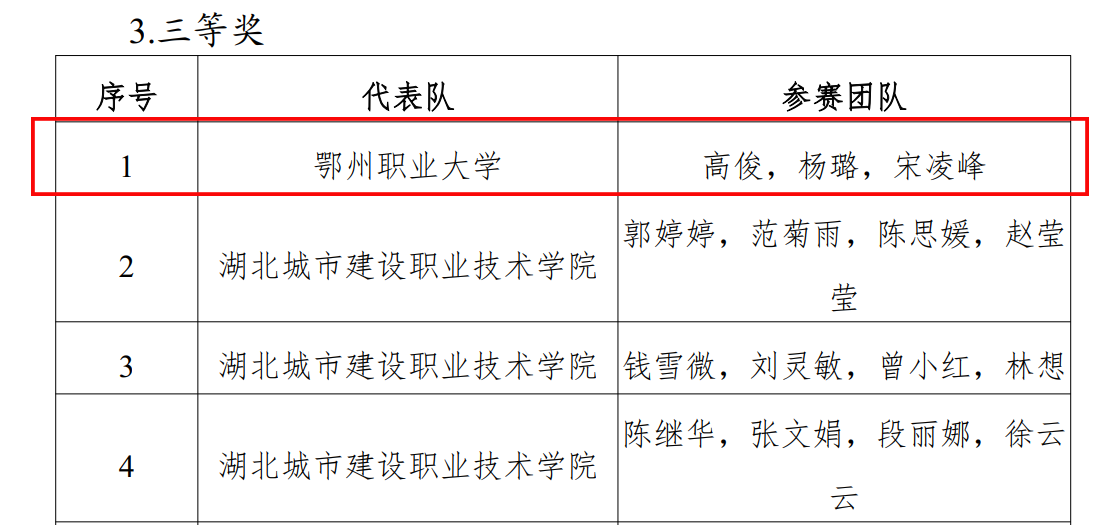 毕春意、余荷花、胡蝶、漆盈教学团队的《高职英语》课程获得高职公共基础课程组二等奖,张淳、盛冠麟、吴雅玲教学团队的《内科护理》课程获得高职专业课程一组三等奖,高俊、杨璐、宋凌峰教学团队的《新能源汽车电机及控制系统检修》课程获得高职专业课程二组三等奖。