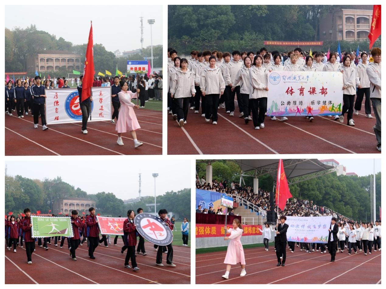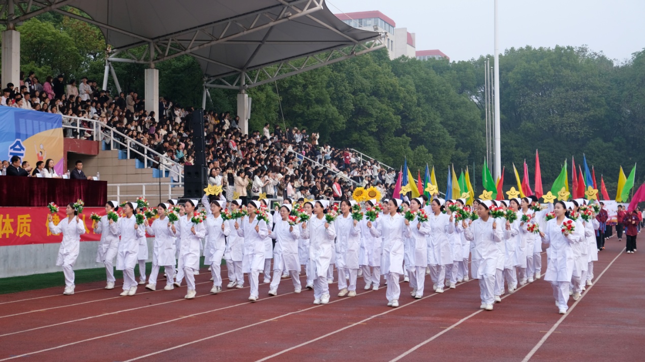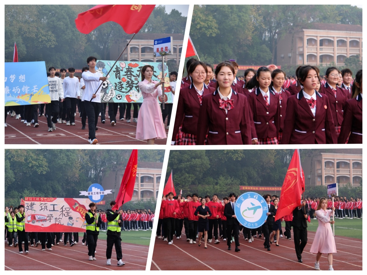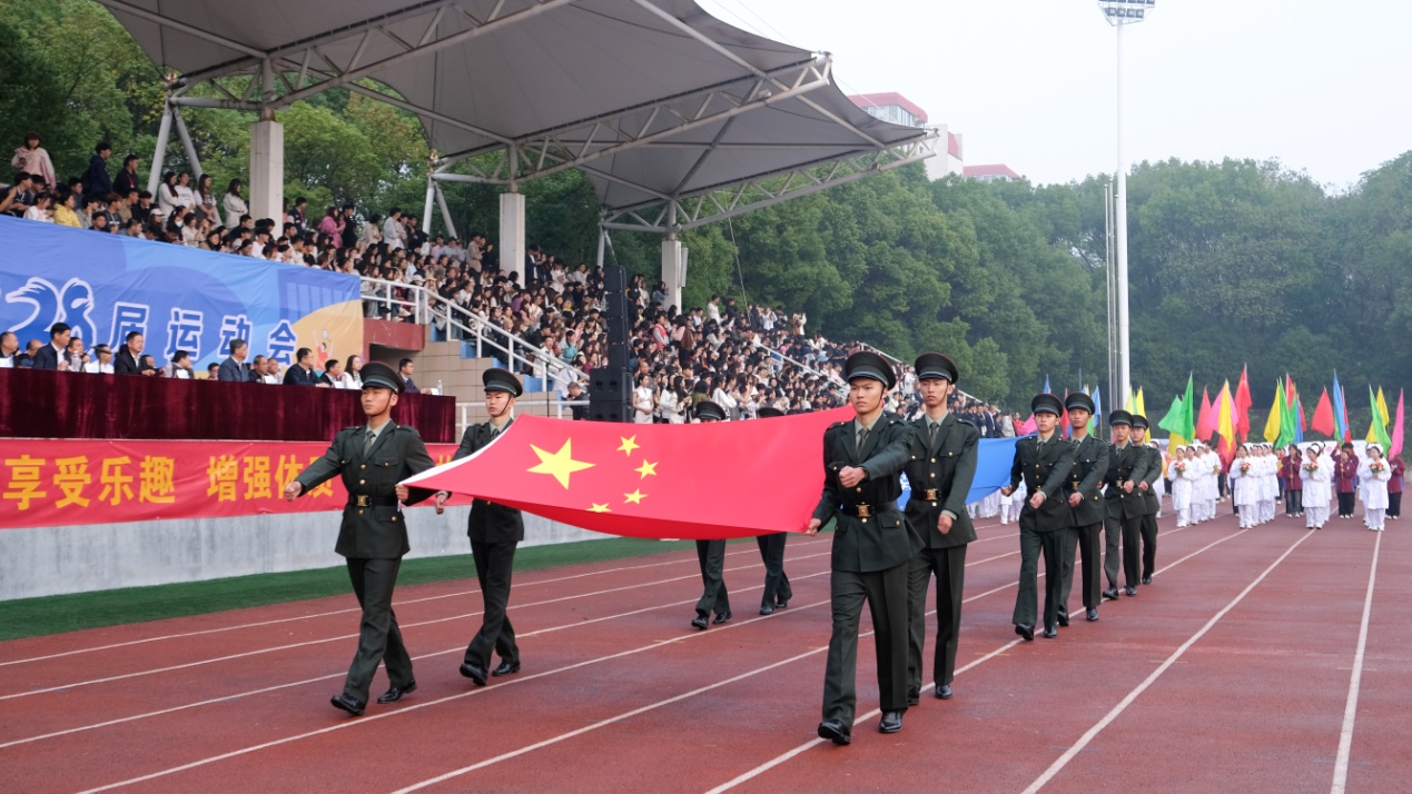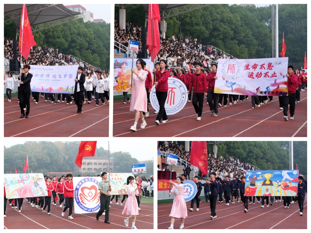 伴随着激昂的《运动员进行曲》,国旗护卫队、鲜花方阵、彩旗方阵和各院(部)运动员方阵、裁判员方阵、演员方阵依次走过主席台。